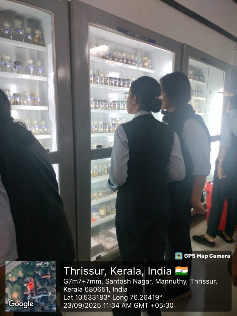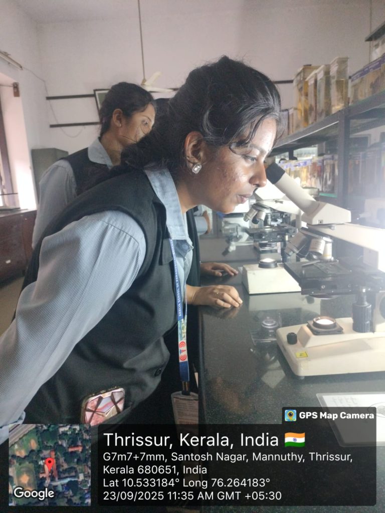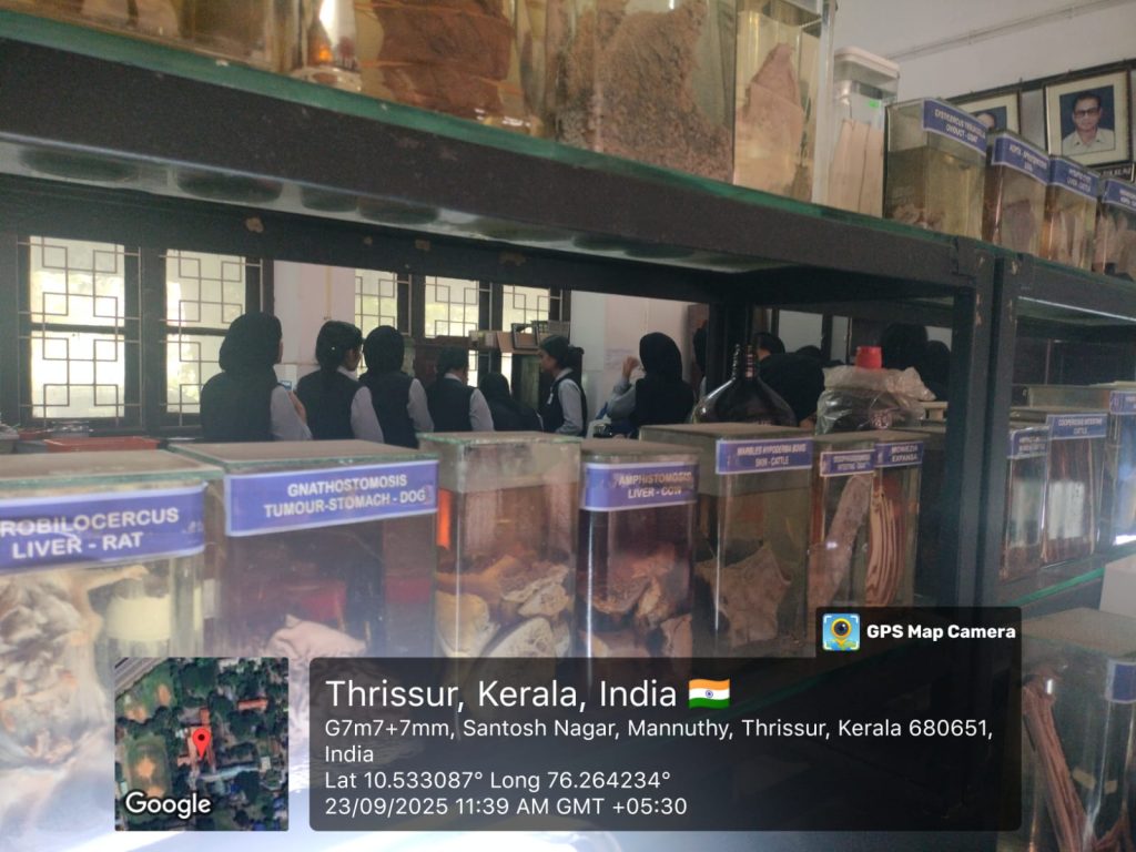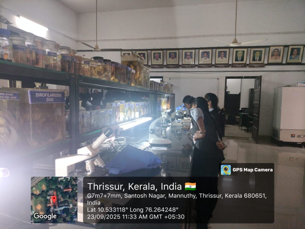 The Second year B.Sc. MLT students visited Mannuthy veterinary college (Parasitology and Small breeding animal station), Thrissur as part of their academic activity, guided by faculty members Mrs. Sruthi and Ms. Malavika. The visit aimed to observe laboratory animals are kept, fed and cared for. And to learn about different parasites that infect humans and animals.