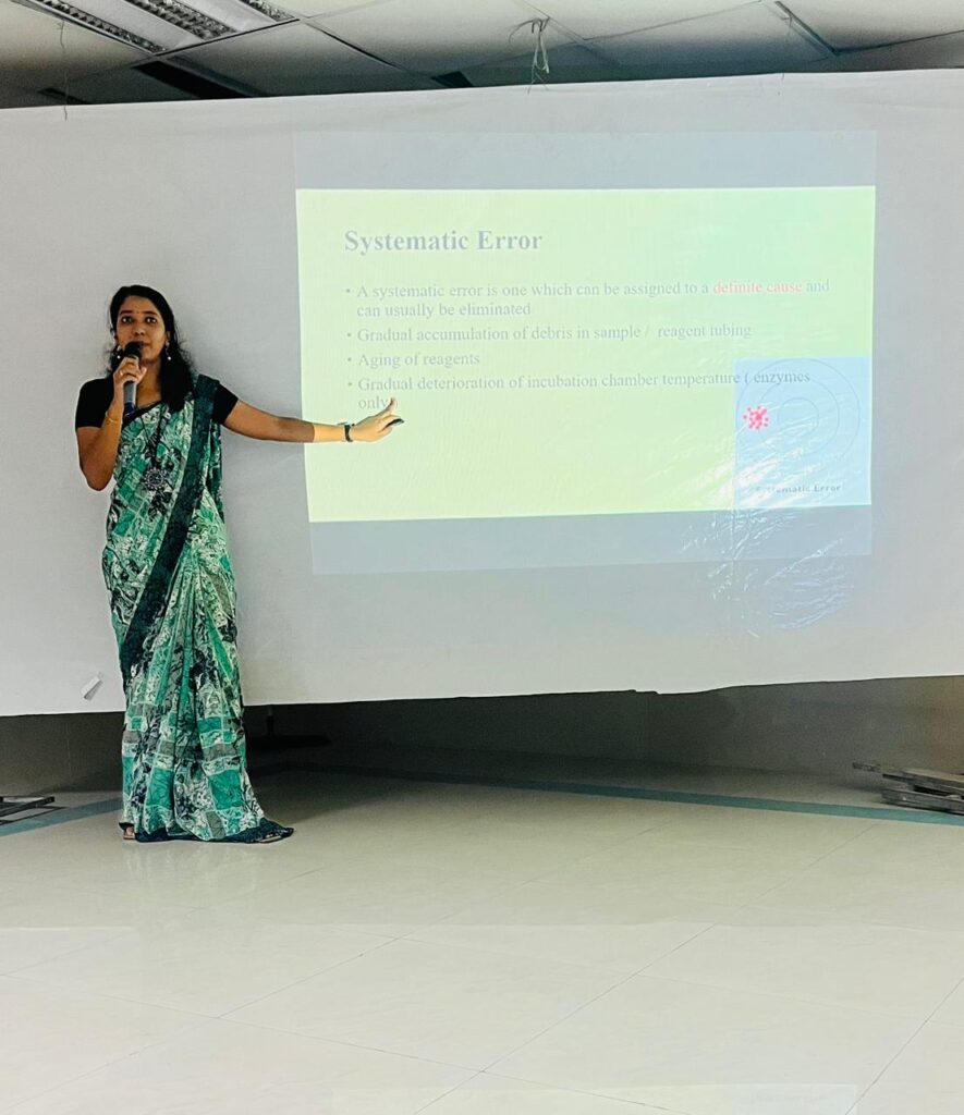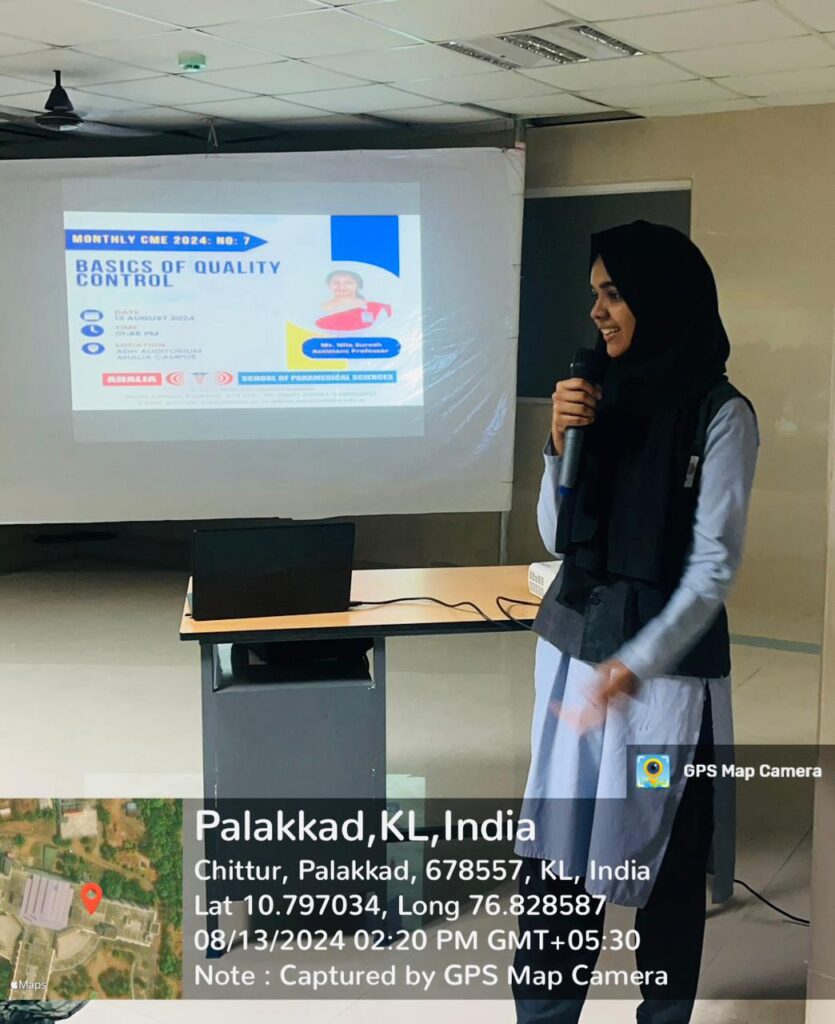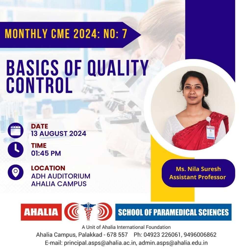 Ahalia School of Paramedical Sciences organized a Monthly CME on “Basics of Quality Control” was conducted by Nila Suresh N on August 13, 2024, at the ASPS Seminar Hall. The session was led by Nila Suresh, Assistant Professor, Department of Biochemistry, and was attended by a total of 150 participants, including both staff and students. The program successfully enhanced participants’ knowledge and understanding of quality control basics, achieving its objective and demonstrating the importance of quality control in healthcare. The event was a valuable educational experience for all attendees.