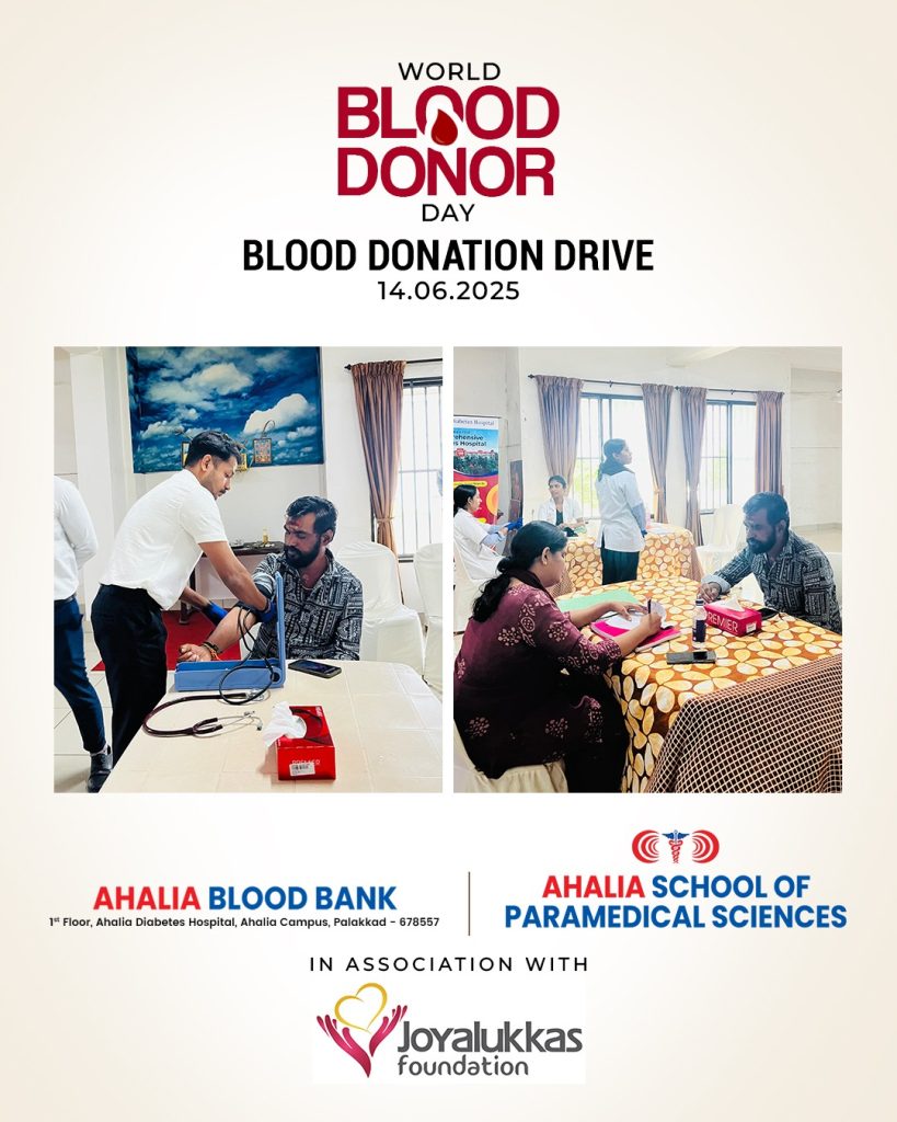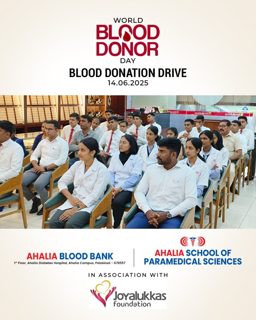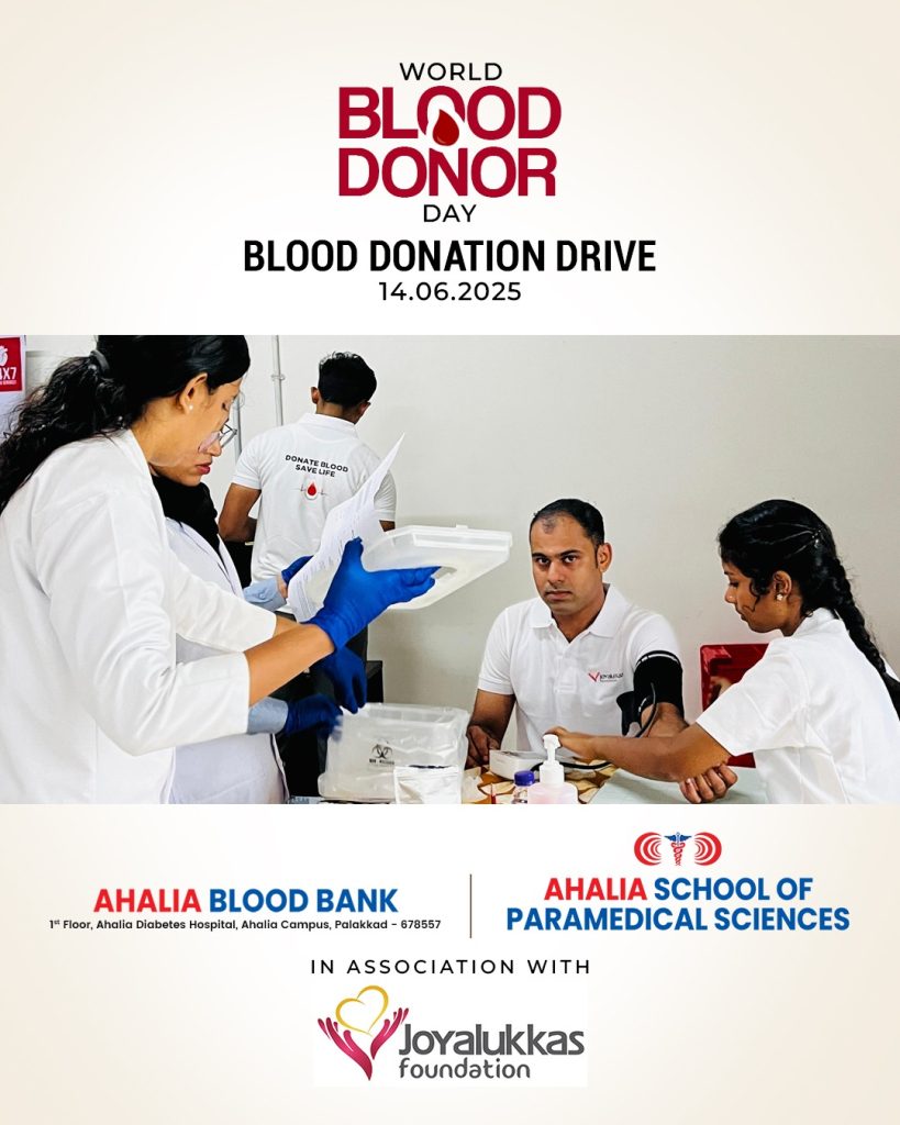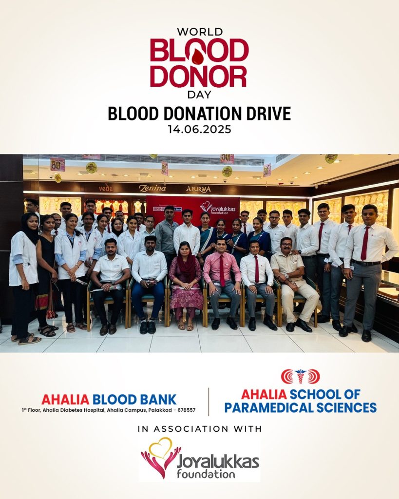 In connection with World Blood Donor Day , a blod Donation Drive was jointly organized by Ahalia School of Paramedical Sciences, Ahalia Blood Bank and Joy Alikkas Foundation on 14th June 2025. The event was inaugurated by the Branch Manager of Joy Alukkas, Palakkad. A total of 14 staff members from Joy Alukkas generously donated blood to the Ahalia Blood Bank. Additionally 5 students from Ahalia School of Paramedical Sciences actively participated in supporting and facilitating the drive.
