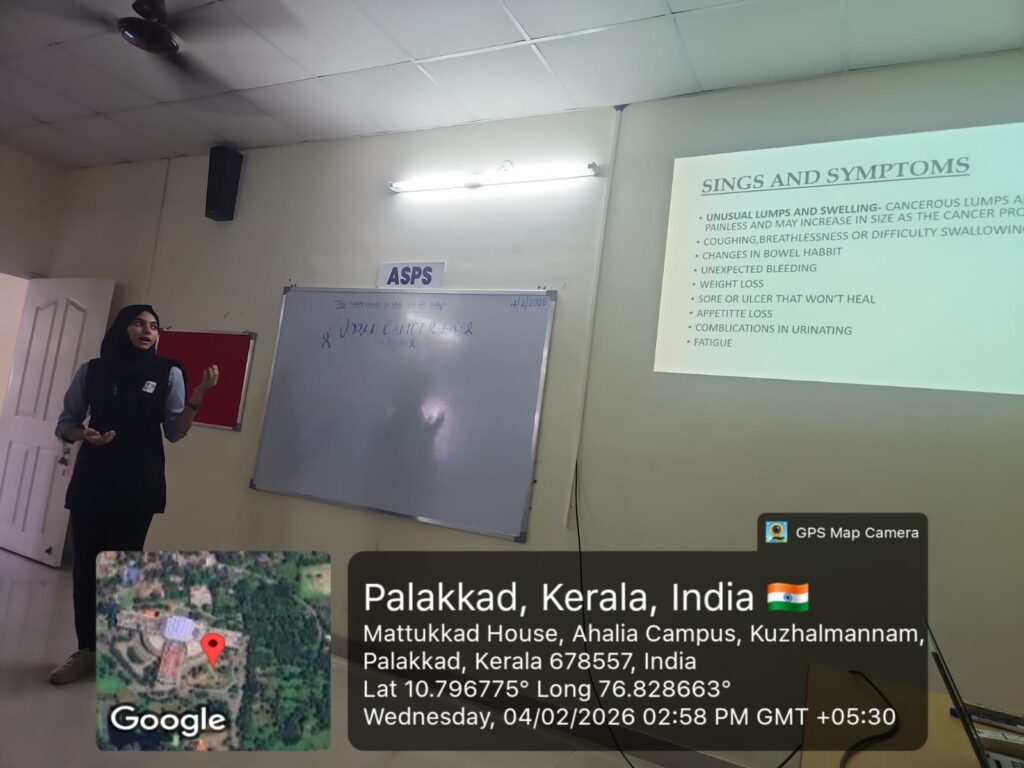 The programme began at 2.30 PM in the Second Year B.Sc. MLT classroom. The Principal addressed the gathering and delivered an informative talk on cancer, emphasizing the importance of early detection, preventive strategies, and community awareness.