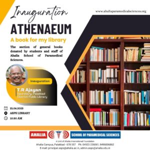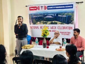 In relation to National Reading Week celebrations Ahalia School of Paramedical Sciences opened a section of general books in library by collecting around 200 books from staff and students of ASPS. The section was inaugurated by Sri. T R Ajayan Sir, Secretary of District Public Library, Palakkad. Mr.Dhanesh Thottathil delivered Welcome address and Presidential address was given by Mr. Sreejith M Nair, Principal, ASPS. Sri. T R Ajayan sir delivered an excellent Keynote address which got much appreciation from audience. Felicitation by Mr. Absul Babu, Associate Professor and Ms. Niloofa, Fourth Year student. offered Vote of thanks Mrs. Nimisha Sadanandan, Assistant Professor.