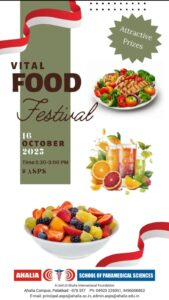 In coordination with World Food Day, Ahalia School of Paramedical Sciences conducted a Vital Food Fest on 16th October 2023 from 1.30 PM. to 4.00 PM which comprised of dishes prepared using healthy ingredients without heating. A diverse variety of dishes were presented by each batch. Second Year, Third Year and First Year bagged first, second and third prices respectively…